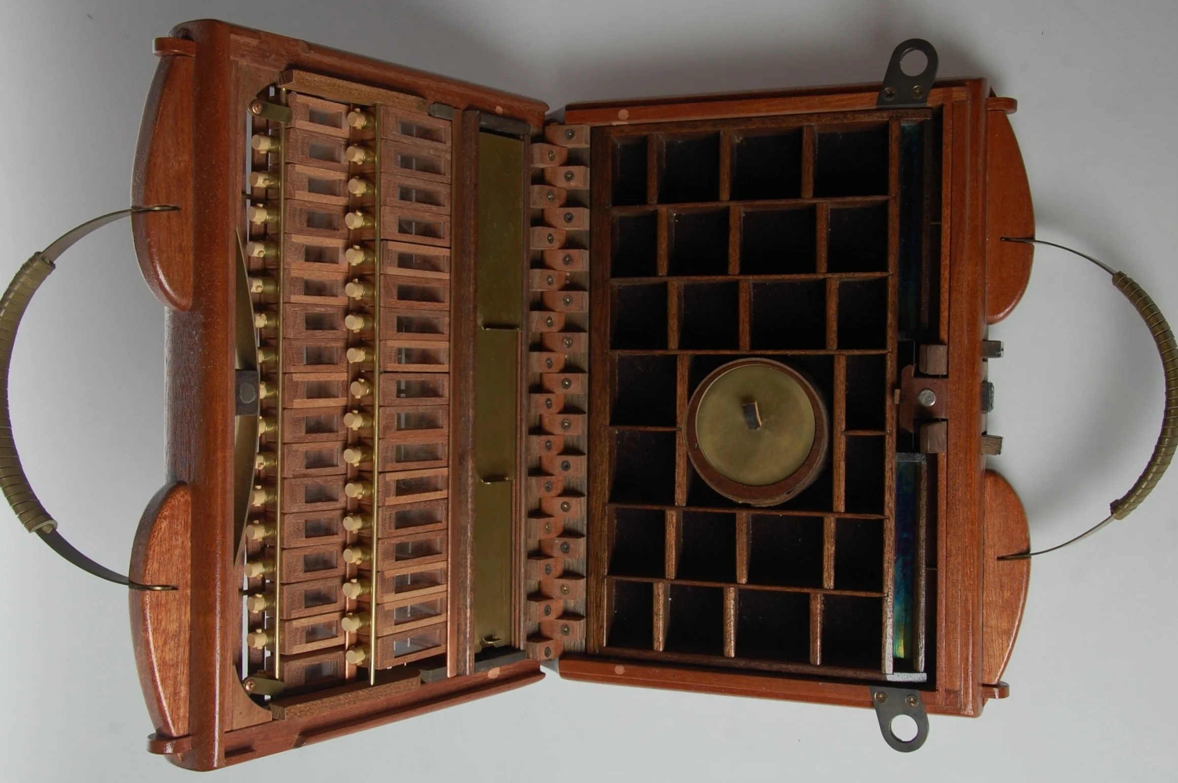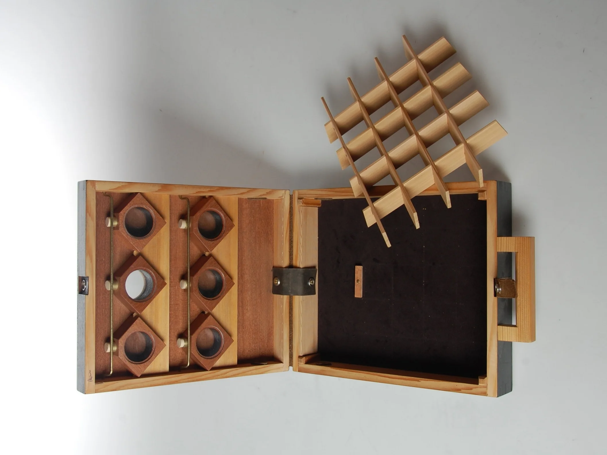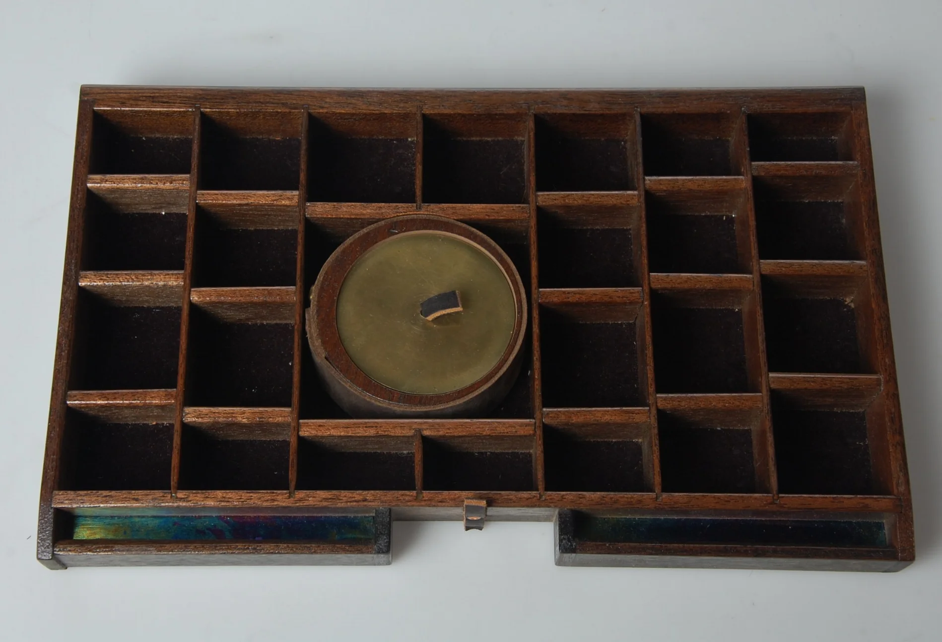 These embroidery cases were commissioned by Textile Artist Rebecca Devaney. The fixtures and fittings required for a professional embroider were identified and every item was considered; containers for sequins, cards for threads, needle holders, drawers, a cotton velvet lined bead pot. Each feature was individually made with care using leather, bronze, brass, copper, and mahogany. Personalised initials were added using reclaimed typeface from the Sag Harbour Express newspaper printing studio. The frame for the case was created by weaving hand cut mahogany into a delicate lattice inspired by traditional Shaker basketry