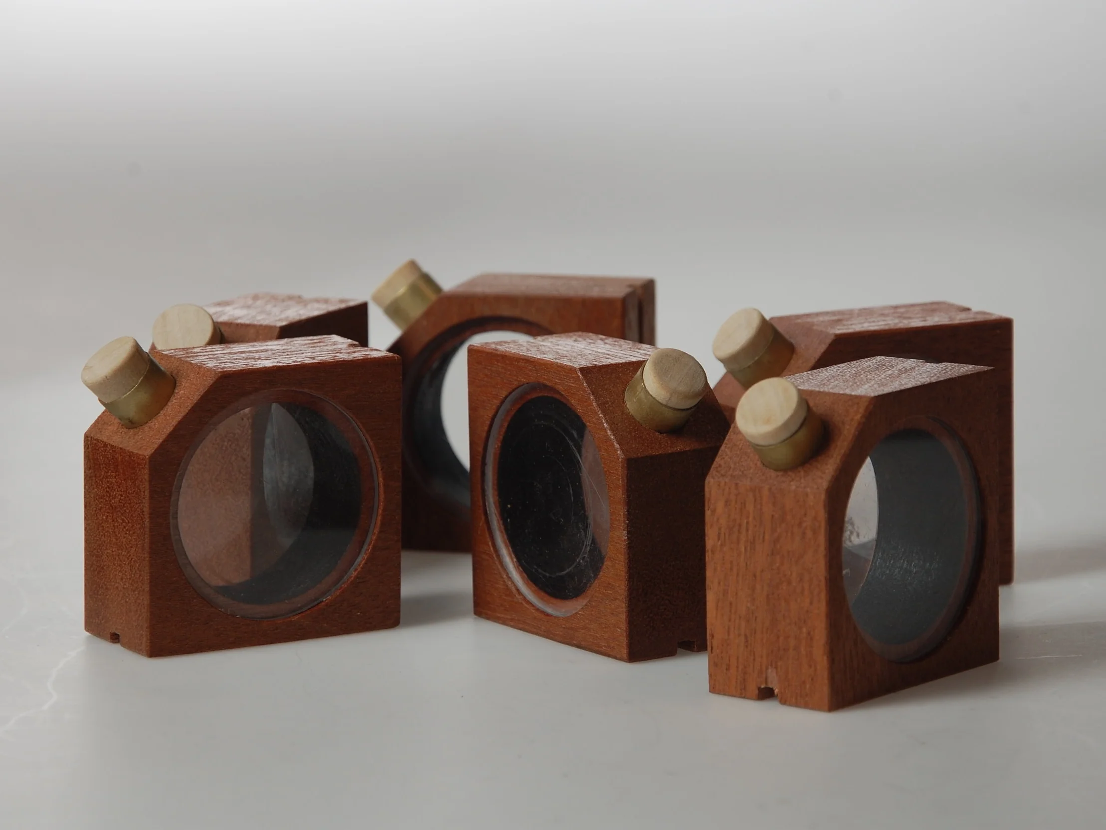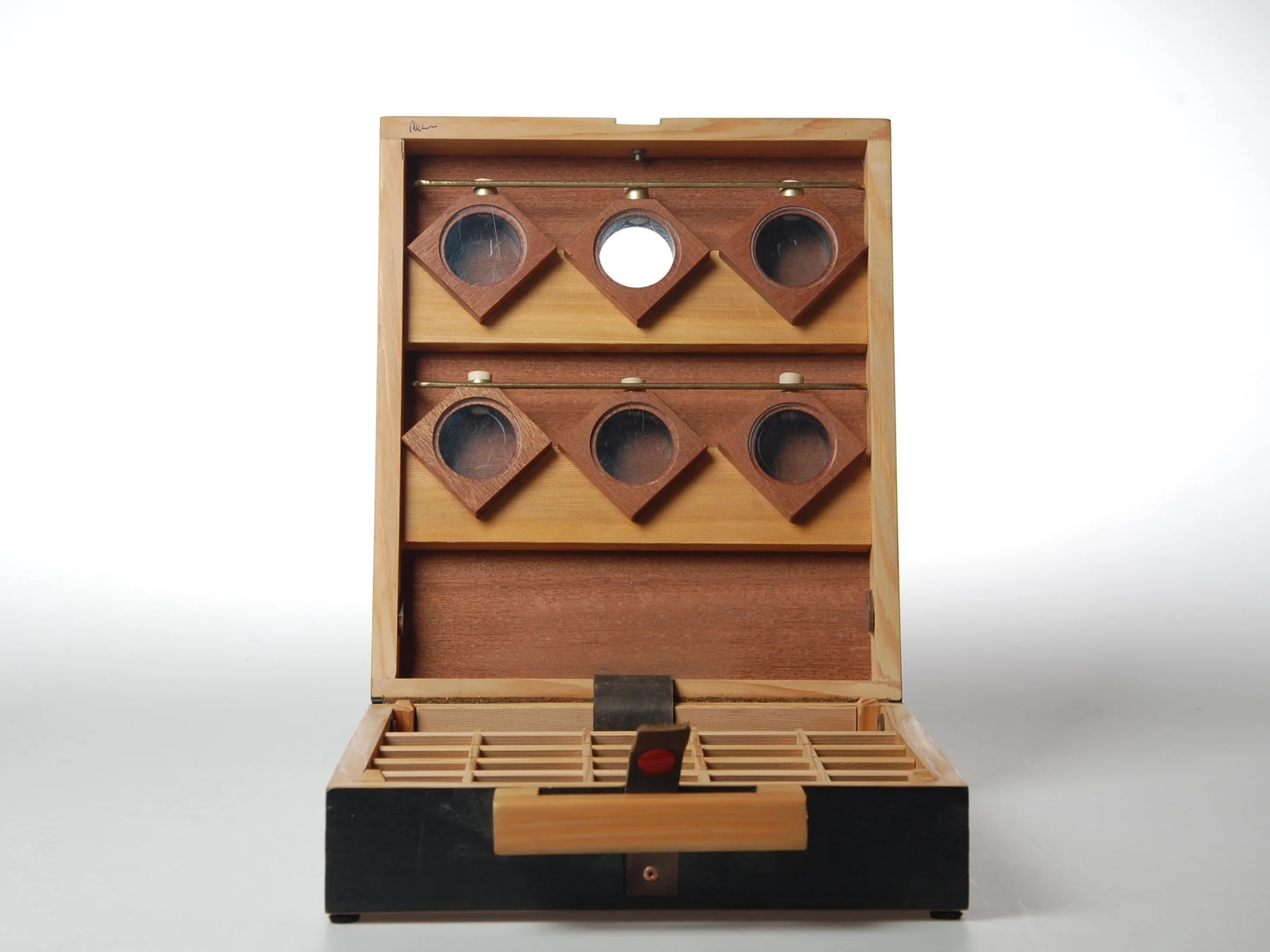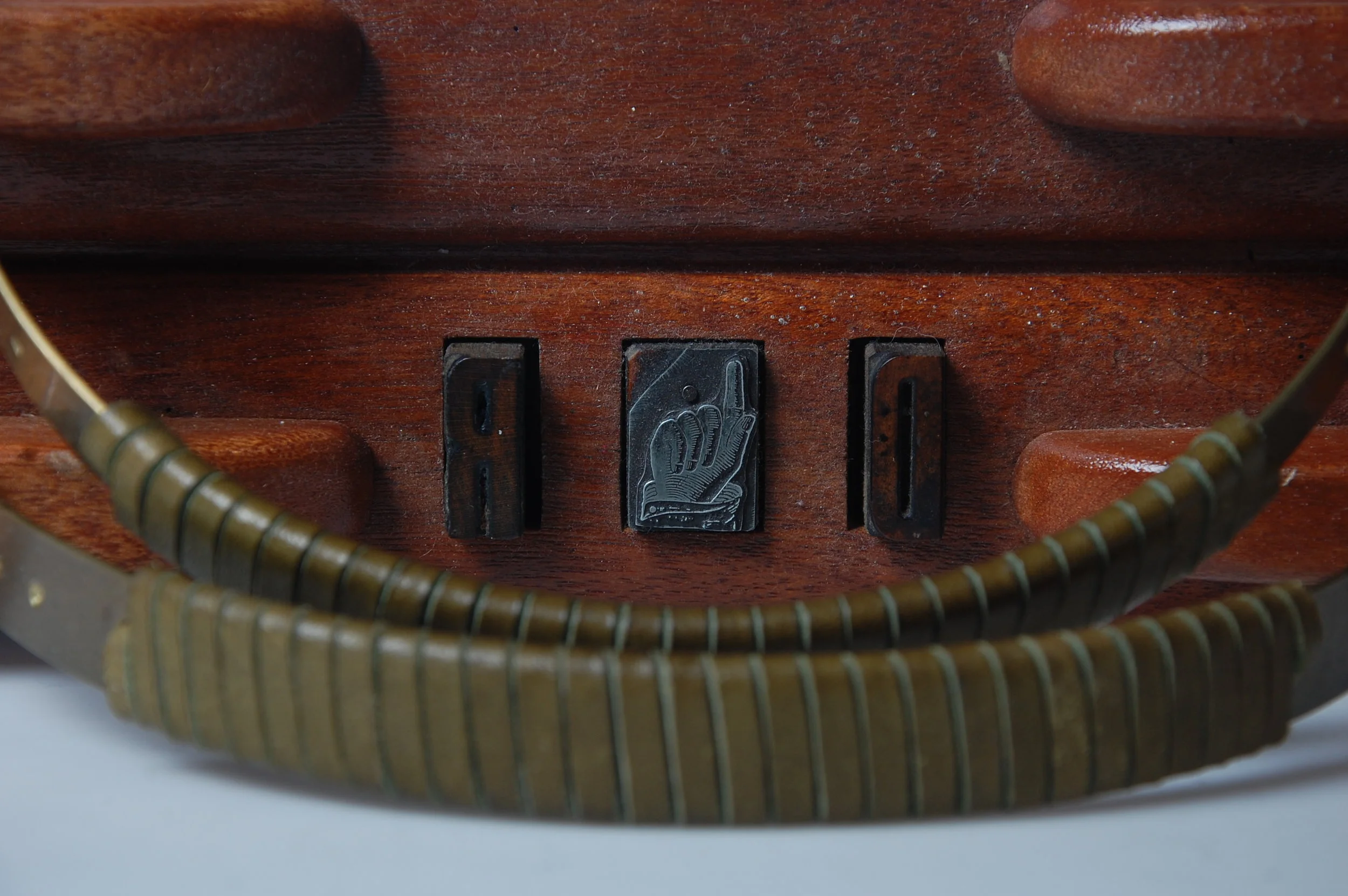 These embroidery cases were commissioned by Textile Artist Rebecca Devaney. The fixtures and fittings required for a professional embroider were identified and every item was considered; containers for sequins, cards for threads, needle holders, drawers, a cotton velvet lined bead pot. Each feature was individually made with care using leather, bronze, brass, copper, and mahogany. Personalised initials were added using reclaimed typeface from the Sag Harbour Express newspaper printing studio. The frame for the case was created by weaving hand cut mahogany into a delicate lattice inspired by traditional Shaker basketry